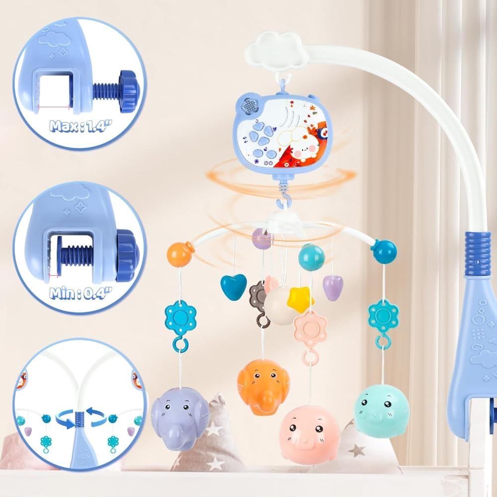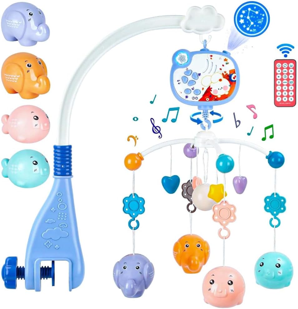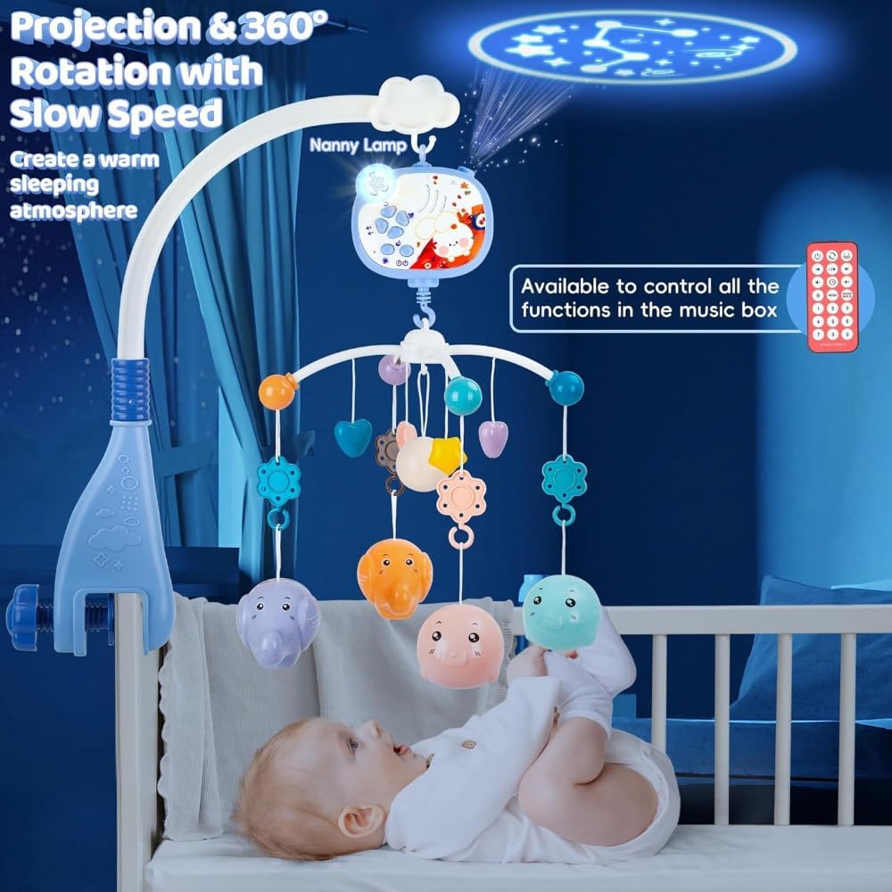 جهاز سرير الأطفال مع ألعاب معلقة ودوارة وموسيقي للأطفال ويعرض أشكالا بالضوء والظل بريموت كنترول