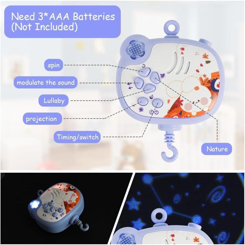 - الجهاز يعمل بواسطة الريموت كنترول وببطاريات، ومزود بجزء للإضاءة يقوم بعرض أشكالا في الغرفة تجذب انتباه الأطفال وتعطي للغرفة شكلا مختلفا ومبهجا.